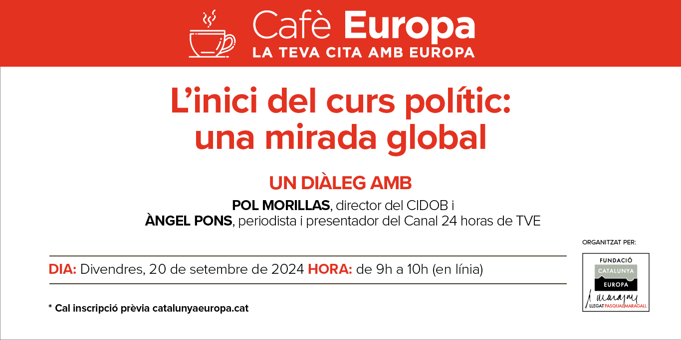 Per tot plegat us animem a continuar atents a les propostes d'informació i debat que us anirem suggerint des de la Fundació, començant pel pròxim dia 20 de setembre, amb el diàleg entre el director del CIDOB, en Pol Morillas i el periodista Àngel Pons en una nova edició del Cafè Europa.